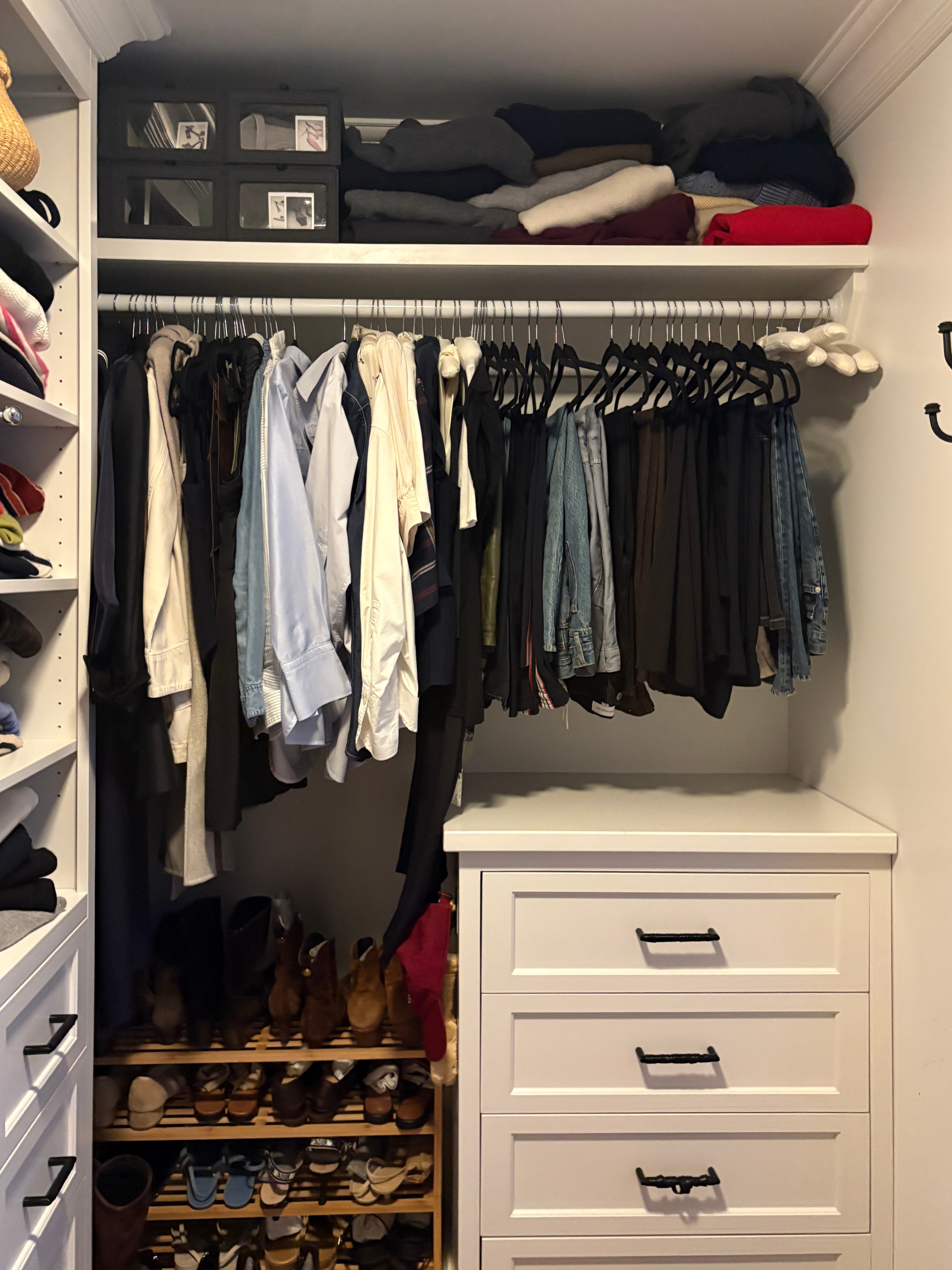I love my closet space. While not huge, it’s organized just how I like it and the perfect size for what I think my wardrobe should be. If it were bigger I could fill it more but I like that I kind of try to keep my clothing and shoes to the space I have. I do have storage for my out of season clothes separate from my closet which allows me to trade out 2x a year and just keep more seasonally appropriate things in my closet, which of course frees up space.