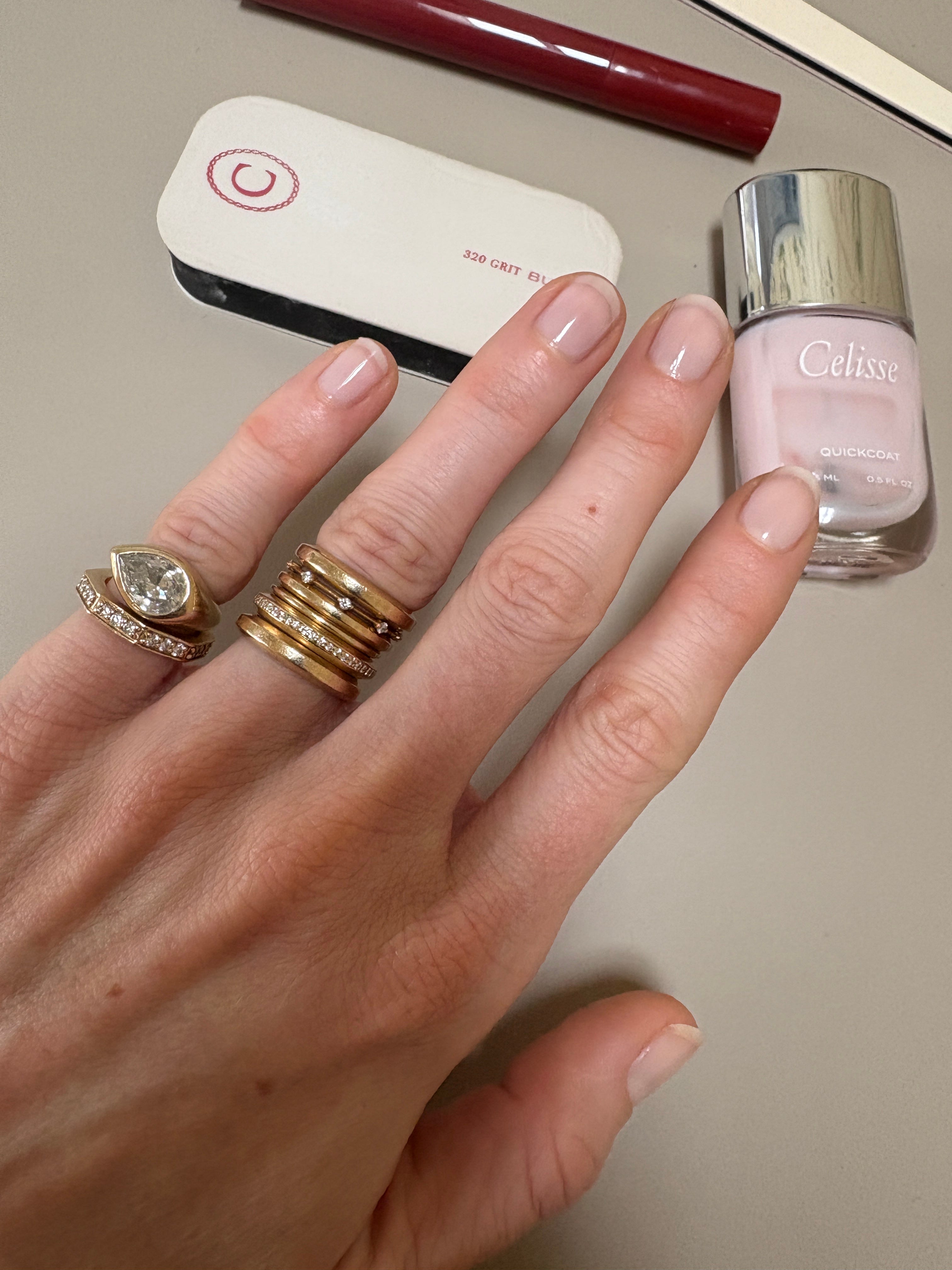 I used to be a dedicated gel polish gal. I would go about every three weeks and though I loved how my nails looked, I hated sitting through the 2+ hour appointment and didn’t love the UV light and Acetone situations. Right around when I decided to quit gel, I discovered Celisse Nail Polish, and it’s been a welcomed change! I love the brand so much that we hosted them at The Fewer Finer Townhouse for an event and collaborated with them on a giveaway (a complementary Full Set with every order back in November). My new weekly routine is that I do my manicure at my desk on Wednesdays. I pick Wednesdays because it’s the day we get back a lot of our pieces from our production in the Diamond District and I want my nails to look nice when I photograph them.