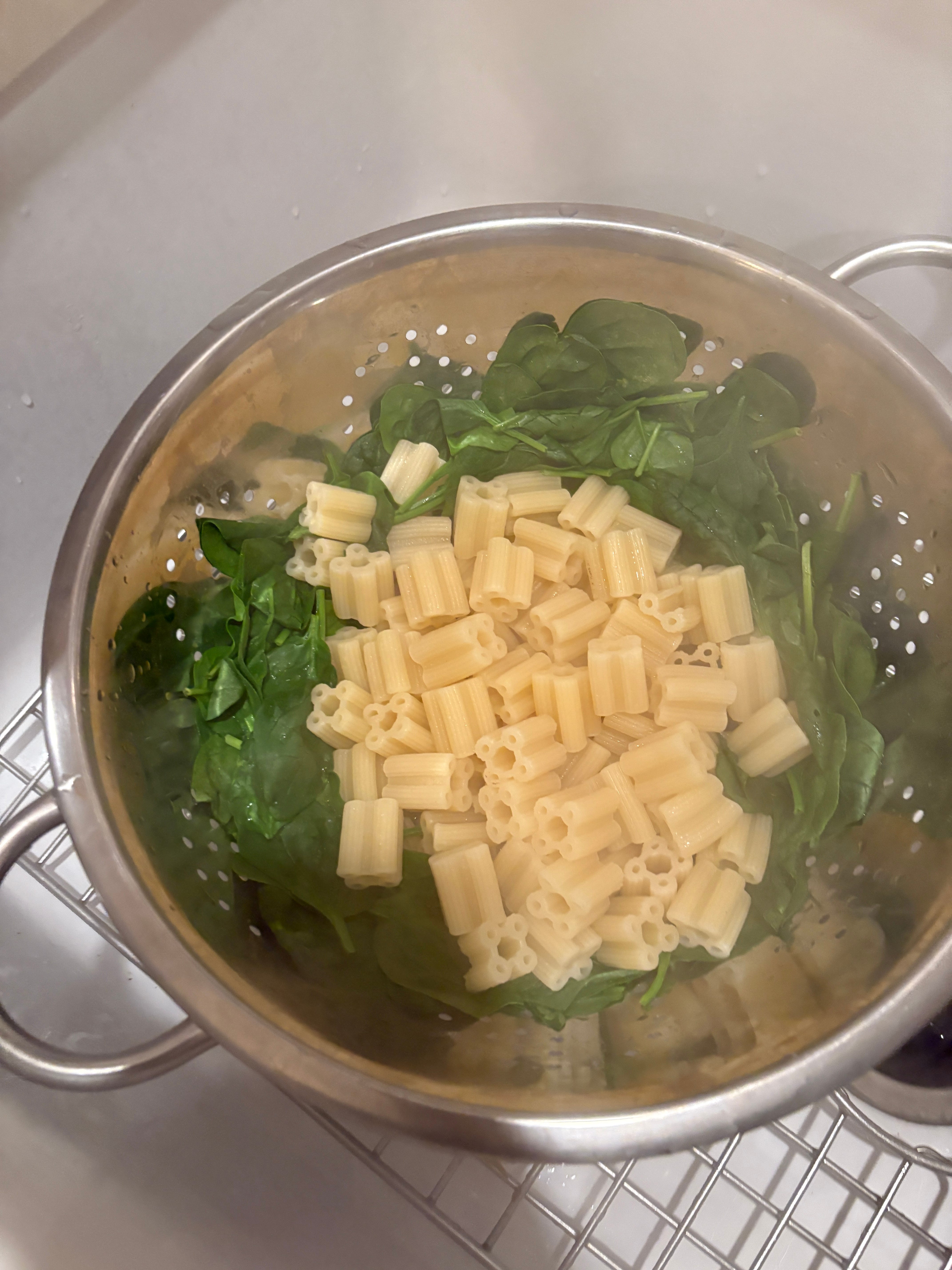 Something I didn’t realize was that when I became a parent I would start eating much differently. It sounds obvious, but I didn’t realize how much more “kid food” I would eat. Enter: a lot more pasta! Then more recently mom taught me this pasta-water-cooking-greens trick that I could not believe I hadn’t been doing my whole life. Here’s how: Chop up your greens, rinse them in the colander, then pour your boiling pasta water and the pasta right over them. It quick blanches spinach and baby kale immediately, no need to cook it! Then, you can mix the freshly “cooked” greens into whatever pasta you’re having. A simple green goes with literally anything - bolognese, vegetable ragù, peas and ricotta, pesto, etc. I love doing this when I’m making a really simple pasta but want to eat greens too!